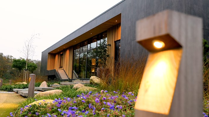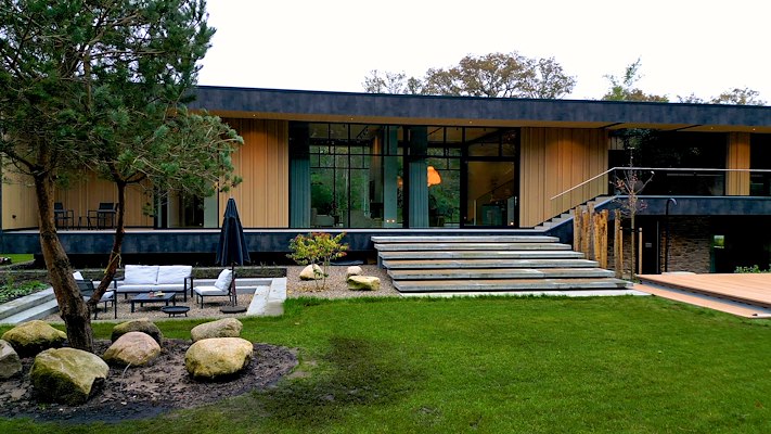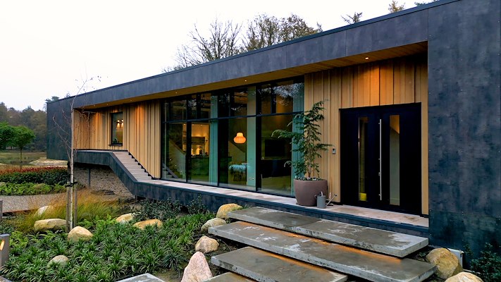 Al van een afstandje is de bosvilla aan de rand van Nationaal Park Sallandse Heuvelrug een bijzondere verschijning. Maar pas als je dichtbij komt, valt de verfijnde detaillering op. Er is enorm veel aandacht en vakwerk gaat zitten in het aanbrengen én perfect op elkaar laten aansluiten van de verschillende houten profielen Elements Vulcan en de HPL-platen Massief NT.