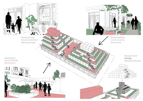 MovA wordt gekenmerkt door een groen landschap aan privé en(semi-)publieke buitenruimten op elke hoogte. Er is een geleidelijke overgang van de publieke straten naar de semipublieke tuin en van deze community tuin naar de privétuinen op hoogte.