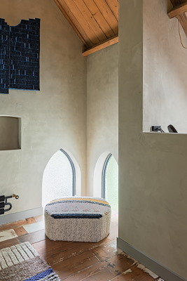 In de kerk/woning is een entresol gemaakt, een gedeeltelijke verdiepingsvloer. Die bevat onder meer de slaapkamers en badkamers. Alleen de muren in de ouderslaapkamer zijn van basisleem voorzien. Vanwege de wensen van interieurarchitect Grutter zijn ze niet met leemfinish afgewerkt, maar met Frescolori. Aan de slaapkamer grenst een badkamer en Grutter wilde dat de slaapkamer en de douche met hetzelfde product zouden worden afgewerkt. Leemfinish was geen optie, vooral ook omdat de afwerking ook op de douchevloer moest komen. Maar het moest wel een natuurlijk materiaal worden dat goed aansluit bij de grijze Yoshina leemfinish en de eigenschappen van leem. Een product ook met de nodige elasticiteit; leem kan wat minder goed overweg met spanning in de toplaag.