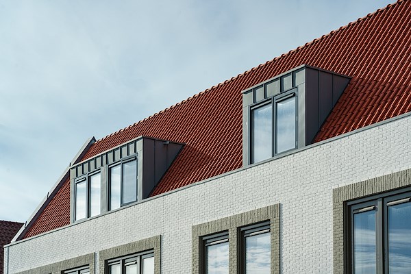 De kap is rondom bekleed met oranje dakpannen. De dakopbouwen in oranje kleur worden opgenomen in het daklandschap en geven daarmee een ruimtelijke differentiatie van het dakbeeld.