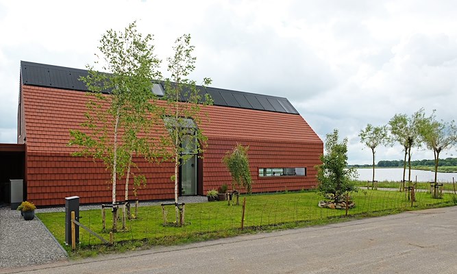 Het huis, uitgevoerd in de eenvoudige vorm van een rechthoekig blok, versterkt met stalen spanten en bekleed met keramische dakpannen, is een baken van stabiliteit, duurzaamheid en minimalistische schoonheid. De eigenaren lieten hun woning bouwen aan de oever van het Woldmeer, niet ver van de stad Groningen. Het huis bevindt zich echter ook nabij het Groninger gasveld, een aardgaslocatie die de afgelopen jaren verantwoordelijk was voor talrijke aardbevingen. Hierdoor moest de woning aardbevingsbestendig zijn, van fundering tot gevelbekleding.