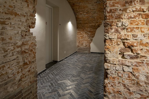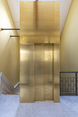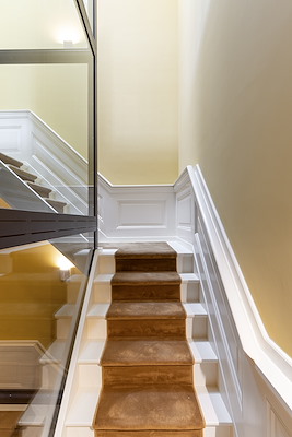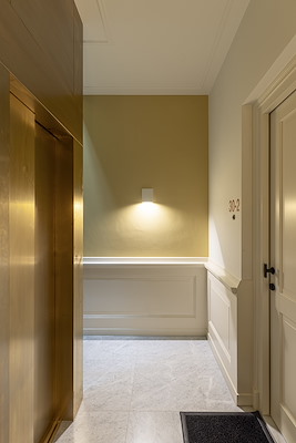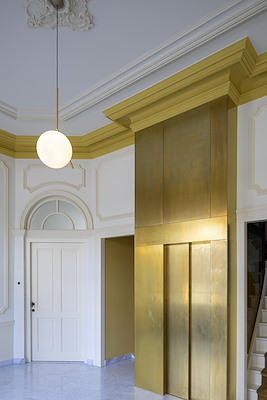 Ook het interieur is naar ontwerp van opZoom in al haar glorie hersteld. De eeuwenoude kelders zijn zichtbaar gemaakt en vormen de entrees naar de studio’s en bergingen. Een strak en minimalistisch ontworpen messing en glazen lift priemt eigenwijs en glamoureus door het gebouw, waar als vanouds de gerestaureerde houten trap omheen slingert. Daglicht valt door een verholen dakraam door de hele hal naar beneden. In de entreehal zijn de houten deuren, lijsten en details hersteld, evenals het glas boven de entreedeuren naar de appartementen. Een warmgeel plafond en trappenhuis sluiten complementair aan bij de marmeren vloeren en plinten en subtiele verlichtingsarmaturen geven de ruimten een warm en huiselijk gevoel.