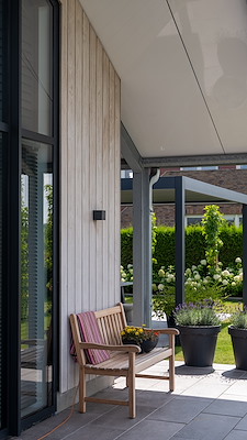 Coen: “Dat was nog wel spannend, want voor mijn gevoel moesten we een beetje blind vertrouwen op het eindresultaat dat je pas na een tijdje ziet. Ik vond het lastig om voor te stellen hoe het er nu precies uit zou komen te zien op zo’n groot oppervlak. Maar het heeft heel goed uitgepakt. Het heeft precies gedaan wat het moest doen. De houten planken zijn nu de perfecte tegenhanger van het donkere dak en de aluminiumbekleding bij de garage. Ook wat dat betreft was ik wel blij met het advies van Bianca. Ik werk vaker met haar samen en het contact verloopt altijd heel prettig. We kunnen altijd bij haar terecht, ze geeft goede adviezen en ze is ook erg betrokken. Dat was hier ook zo: ze was erg benieuwd naar hoe het er uiteindelijk uit was komen te zien. En ik kan wel zeggen dat we allemaal erg trots zijn op het eindresultaat.”