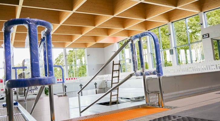 Het L-vormige roestvrijstalen zwembad biedt een 25-meterbad met vijf banen, geschikt voor trainingen en wedstrijden, en een kindergedeelte met interactieve waterattracties. Daarnaast beschikt het ook over een 1-meter en 3-meter duikplank.