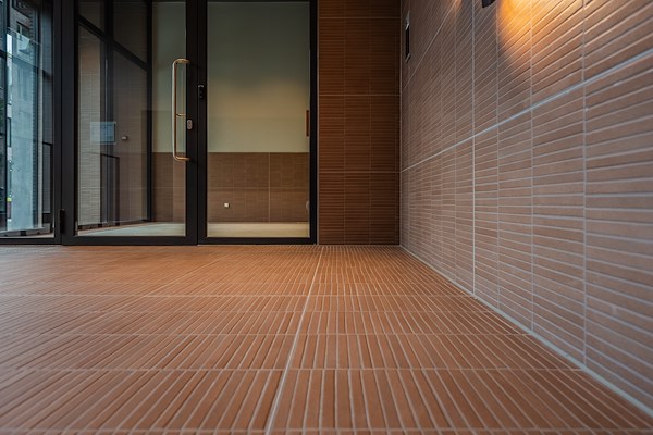 Het gebouw is opgetrokken in de baksteenstijl en kleur van de Amsterdamse School, wat perfect past bij de keramische bricks tegels van ItalGraniti.