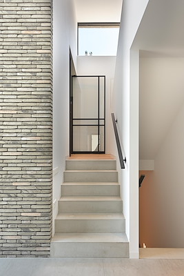 De baksteen was van groot belang in dit ontwerp gezien de bestaande bakstenen bouwwerken verderop. In de hal van de woning wordt deze doorgetrokken en wordt de steen dus in de hele woning ervaren. “De steen gaf ons het juiste ‘gevoel’ voor dit project. Verfijnd, fraai en verwerkbaar”, geeft Ronald aan. Bovendien wisten de architecten dat de steen een goede verwerkbaarheid heeft dankzij het succes bij een vorig project waar deze gevelsteen werd toegepast in staand rond metselwerk.Het pallet aan materialen wordt bewust zo beperkt mogelijk gehouden zodat er een krachtig beeld kan ontstaan. Naast de baksteen wordt de woning nog voorzien van aluminium gevelplaten en aluminium kozijnen.