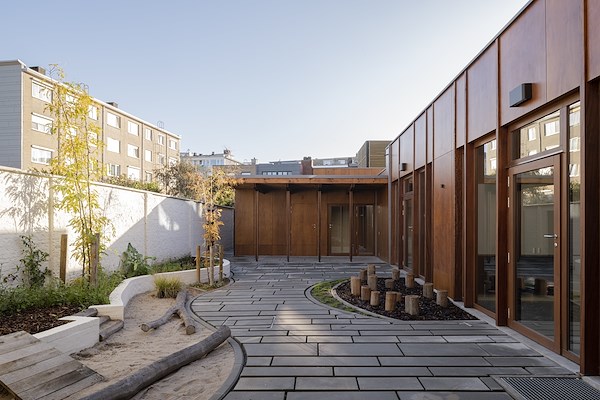 Niet alleen de kinderen genieten van een groene buitenruimte; ook voor het personeel is aan de straatzijde op de tweede verdieping een groot terras met plantenbakken ingericht. Daarnaast beschikt het pand over een groendak, dat bijdraagt aan de biodiversiteit en een verkoelende werking heeft. Dankzij het regenwaterrecuperatiesysteem wordt bovendien de duurzaamheid van het gebouw verder versterkt.