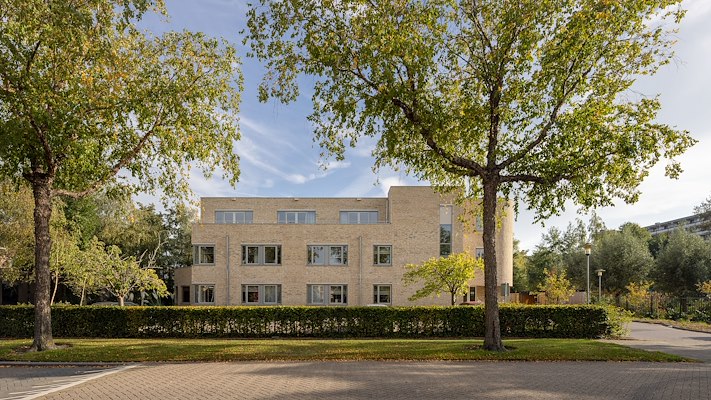‘De situering van het pand en de buitenruimte op het kavel maakte de locatie uitermate geschikt voor woonzorg, echter de omvang van het bestaande gebouw was daarvoor niet toereikend’, aldus Gert. ‘Daarom hebben we het gebouw zowel in de diepte als de hoogte uitgebreid en daarmee ook de architectonische compositie aangescherpt. De geelkleurige steen past mooi in het palet van de context.’