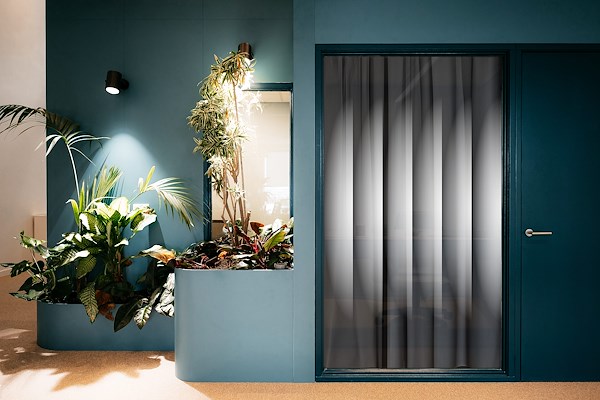 Voor de decoraties op de glazen wanden is gebruikgemaakt van Clear View folie met een witte print, geproduceerd en aangebracht door Iwaarden. Clear View is, zoals de naam al aangeeft, een glasheldere folie met een hoge transparantie. De decoratieve print op de folie bestaat uit een lamellenpatroon, waarbij het wit in een vloeiende gradiënt is geprint. Dit levert een bijzonder effect op: wanneer je langs het raam loopt, lijkt de decoratie en transparantie met je mee te bewegen. Verandert je kijkhoek, dan verandert ook de mate van inkijk. Het eindresultaat? Een prachtig samenspel tussen sfeer en privacy.