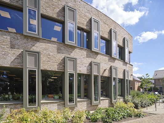 Om voldoende daglicht te creëren zijn de onderwijs- en opvangruimten over de volledige breedte voorzien van horizontale bandramen. De toegepaste verticale bloemkozijnen, waarin ook de draaiende delen zijn opgenomen, creëren een prettig ritme en geven de gevel de gewenste dynamiek. Naast de esthetische waarde komen deze kozijnen ook voort uit de integrale ontwerpopgave. Ieder lokaal is namelijk voorzien van een decentrale ventilatie unit. De benodigde roosters zijn geïntegreerd in de bloemkozijnen.