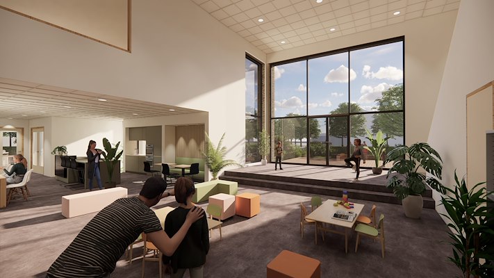 Wanneer je via de hoofdentree het gebouw betreedt, sta je gelijk in het multifunctionele hart van het gebouw dat wordt gekenmerkt door een grote loungeruimte met open keuken. Daaraan grenst de ontmoetingsruimte die, gecombineerd met het speellokaal en het podium, volop mogelijkheden biedt voor onderwijs en toneel – een van de speerpunten van de school.