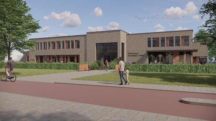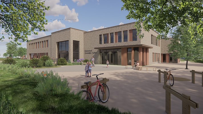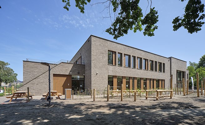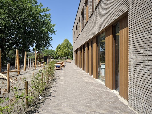 Het kindcentrum is opgetrokken uit beige/bruin genuanceerd metselwerk in combinatie met houten vlakken die het gebouw een natuurlijke, warme uitstraling geven. We hebben gespeeld met de grootte van de gevelopeningen op begane grond en verdieping. Zo ontstaat een dynamische uitstraling. Ramen zijn - verdekt - opgenomen in de houten delen van de gevel.