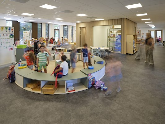 Vanuit het hart worden de verschillende ‘vloeren’ ontsloten. Deze vloeren zijn lesruimten voor kinderen van aaneenschakelende leerjaren. Zo is vloer één voor de kinderen van het kinderdag verblijf (0-4 jaar), vloer twee voor de kleutergroepen (4-6 jaar), enzovoort. De vloer voor de kinderopvang is ingedeeld in afsluitbare groepsruimten met daaraan grenzend slaapkamers, verschoonruimten, bergingen en een keuken en is fysiek te koppelen aan de kleutervloer.