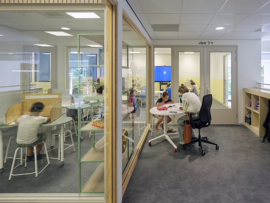 De onderwijsvloeren zijn open onderwijsruimten met meerdere instructie- en verwerkingsplekken. De toiletgroep, berging en een spreek-/werkruimte liggen als een eiland midden op de vloer. Zo ontstaat binnen de open leeromgeving toch de gewenste beslotenheid en rust.