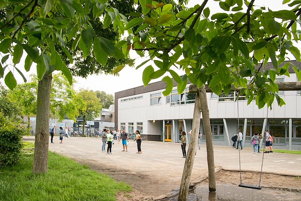 De school heeft een halfronde vorm en sluit daarmee mooi aan op de context. Bovendien ontstaan er fijne, geborgen plekken op het speelterrein die de overgang van buiten naar binnen versterken en - door de schaduwwerking - bijdragen aan een prettig binnenklimaat. Het gebogen dak van de sportzaal is een eyecatcher die de dynamiek van deze ruimte nog eens extra benadrukt.