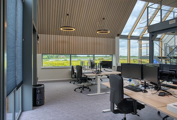 De drie verdiepingen van het pand zijn intern ruimtelijk met elkaar verbonden door trappen en vides. Zo ontstaan interessante zichtlijnen en een doorlopende kantoorvloer over meerdere lagen die de samenwerking tussen de medewerkers bevordert. Strategisch geplaatste gevelopeningen bieden medewerkers en bezoekers een panoramisch beeld over de uiterwaarden en de Rijn.