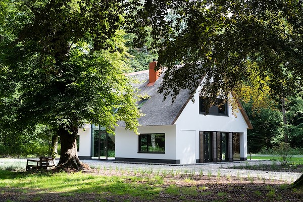 Het woonhuis is helder van opzet. Het rechthoekige volume heeft gestucte gevels, een rieten kap en een grote entreepui die doorloopt tot in het dak. Op strategische posities zijn gevelopeningen opgenomen die de bewoners optimaal laten genieten van de bosrijke omgeving. Ze kunnen worden afgesloten met harmonicale louvres.
