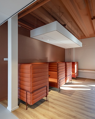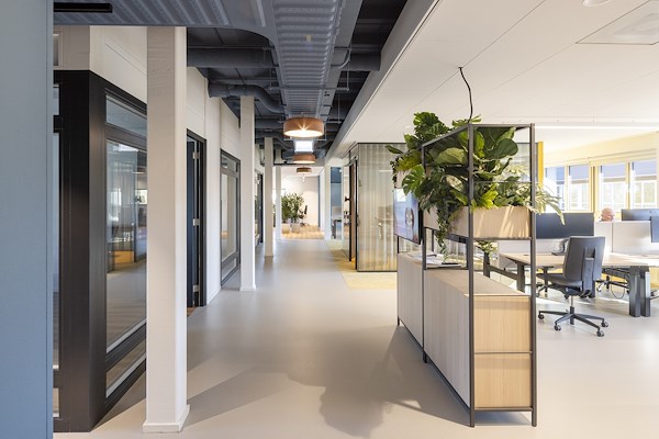 Zowel op gebouwniveau als in het interieur was het volgens de architect vanzelfsprekend dat er grote aandacht is besteed aan circulariteit en duurzaamheid. “Wat behouden kon blijven is behouden. Waar mogelijk zijn bestaande wanden blijven staan. Glazen puien en (geluidwerende) deuren zijn op nieuwe posities hergebruikt en er is niet gestuct. Frisse lucht, een prettige temperatuur, veel (dag)licht, veel groen en een goede akoestiek dragen bij aan een gezonde werkomgeving. Door nieuwe ramen in de gevel te maken en wanden weg te halen, is er nu veel meer daglicht in het gebouw. De akoestiek is verbeterd, onder andere door toevoeging van doeken met grafische ontwerpen die onderdeel zijn van het interieurontwerp. Het groen is zoveel mogelijk met echte planten ingevuld en wordt door een externe partij onderhouden. Bij de keuze voor het meubilair is gekozen voor zo veel mogelijk hergebruik, aangevuld met circulaire en duurzame producten, zowel in productie als in onderhoud en levensduur”, aldus Westinga.