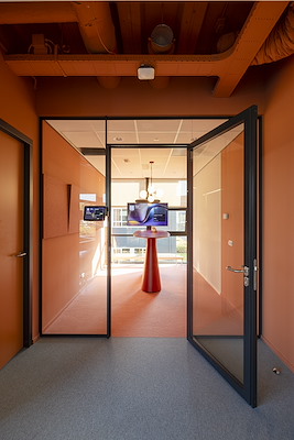 Het entreegebied is open en toegankelijk met een centrale ontvangstbalie. Daarachter bevinden zich de grote vergaderruimten en het mediacafé. “Alle vergaderruimten hebben een eigen identiteit gekregen, met een inrichting die subtiel verwijst naar de Brabantse cultuur”, legt Westinga uit. “In het mediacafé wordt geluncht, overlegd en gewerkt, een gemoedelijke ontmoetingsplek die voor iedereen toegankelijk is. Op de twee verdiepingen zijn de werkplekken gegroepeerd in kleine eilanden, gescheiden door kasten met veel groen en afwisselend met projectruimten, belcellen en vergaderruimten.” Bij binnenkomst van het pand vallen direct de kleuren op, bijvoorbeeld de oranje gekleurde installatiebuizen die extra opvallen in het verder zwart gekleurde plafondveld. De drie verdiepingen hebben ieder een eigen basiskleur gekregen die op de wanden terugkomt, variërend van oranje, rood/bruin en blauw. Accenten worden gevormd door kleurrijke akoestische wandpanelen, veelal met passende prints. Westinga: “Het ontwerp is kleurrijk en rijk aan materialen, zonder overdadig te zijn. De basis is rustig en licht. Op elke verdieping zijn delen van het plafond verwijderd en in kleur gespoten. Samen met de gekleurde wanden en de grafische prints van de ‘landmarks’ maakt dit elke verdieping bijzonder.”