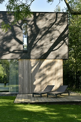 Door het gebruik van donkere Hagemeister bakstenen voor het volume op de bovenste verdieping lijkt het alsof het zweeft boven de glazen wanden en 'gordijnen' van Plato houten gevelbekleding op de begane grond.