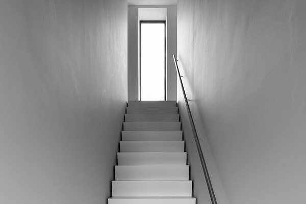 Verborgen ramen op de bovenste verdieping, geen raamkozijnen te bekennen, alles achter het metselwerk verscholen.