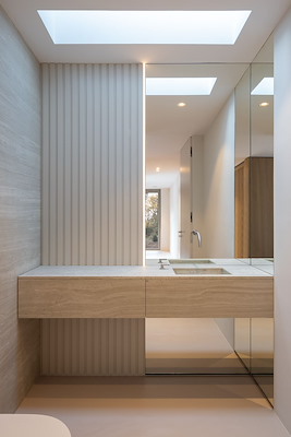 De zachte, minimalistische designaanpak komt zowel binnen als buiten tot uiting. Door subtiele kleuren, natuurlijke materialen en verfijnde texturen toe te passen die elkaar aanvullen in plaats van overheersen, is een harmonieus geheel ontstaan. Dit zorgt voor een warme, prettige sfeer waarin architectuur en natuur samensmelten.