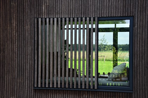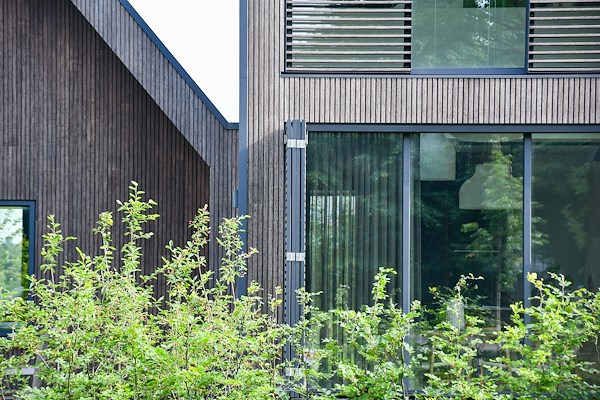 Wanneer de luiken gesloten zijn, zorgt dit niet alleen voor privacy en optimale zonbescherming. Deze luiken zijn bepalend voor de architectuur van deze woning.