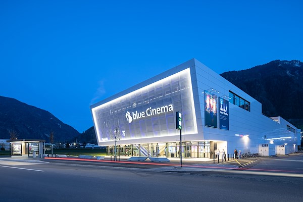 architekten. The cinema’s long façades feature few openings and are clad in Signal White ALUCOBOND® tray panels using a horizontal layout. This layout inevitably draws the eye along the full length of the building to the high-rise buildings located behind, creating a visual link and design connection with the new district, despite being separated by railway lines. People leaving the City West shopping centre walk across an inconspicuous bridge to arrive on the second floor of the cinema complex. This is the main foyer and comprises a shop, a restaurant and a roof terrace which offers mountain panoramas like an open-air cinema. The building’s welcoming main façade, however, overlooks the motorway and commercial area on the opposite north-facing side. The architects tilted this façade and covered it with a semi-transparent fabric so images from the interior can be vaguely discerned from outside. Especially at night, the façade turns into the proverbial big screen: