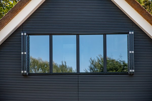 De vouwluiken vallen mooi weg als ze gesloten zijn, ze zijn namelijk een verlengstuk van de gevelbekleding. Dit zorgt ervoor dat de woning een strak uiterlijk heeft.