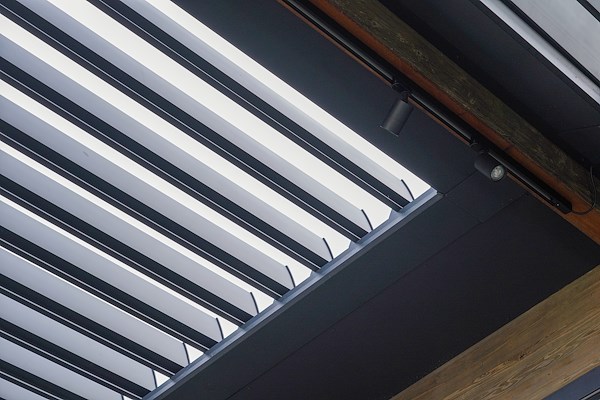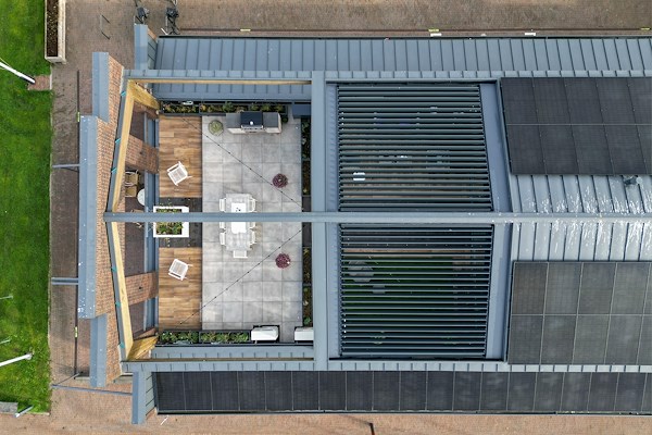 Deze overkapping is extra speciaal omdat de constructie schuin is geplaatst. Ondanks deze schuine bouwstijl, zijn de lamellen toch zeer praktisch. Ze zorgen niet alleen voor perfecte zonwering: deze lamellen doen nog veel meer! Uitstekende bescherming bieden tegen de regen bijvoorbeeld. Deze gecreëerde overkapping is daarnaast niet alleen praktisch, hij is ook erg mooi en past uitstekend in de rest van de bouwstijl.