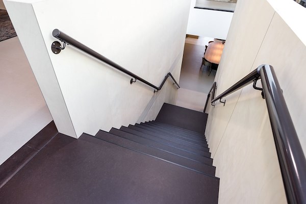 De keuze voor LiquidDesign kwam van BDG Architecten. ‘In de nieuwe regiokantoren van Enexis Netbeheer is veel aandacht besteed aan duurzaamheid’, legt Wim uit. ‘LiquidDesign is niet alleen een stijlvolle vloeivloer met een prettige akoestiek en dempende eigenschappen, het bestaat ook uit duurzame en hernieuwbare grondstoffen zoals kurk, houtmeel en gemodificeerde castorolie. Voor architecten, die steeds vaker kiezen voor duurzaamheid, is LiquidDesign dan ook een aantrekkelijke vloerafwerking. Daar komt bij dat er keuze is uit maar liefst 22 fraaie basiskleuren, plus de mogelijkheid van een special voor grotere projecten.’ Tijdens onze rondgang wijst Wim ons op nog een bekende: Marmoleum Cocoa van Forbo Flooring, waarmee een trap en de vloer in een plotterruimte zijn afgewerkt. ‘In dit Marmoleum zijn gerecyclede cacaoschillen verwerkt, ook een duurzaam product dus. Net als de wanden van donkerbruin leem, eveneens een natuurproduct en tegelijk geluiddempend.’ Het moet gezegd, ondanks de bedrijvigheid in het gebouw, is het geluidsniveau overal zeer aangenaam.