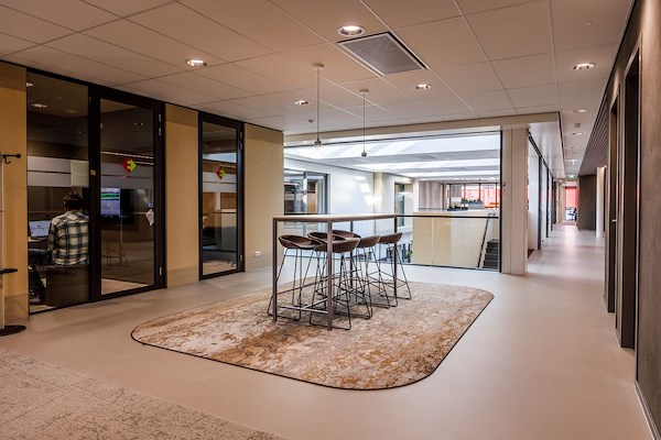 We volgen Wim de Pee naar binnen en direct proeven we de aangename atmosfeer. Veel licht en ruimte, een prettige akoestiek en volop afwisseling tussen de werkplekken. Van rustieke zitjes en afgesloten, maar transparante ruimten waar je rustig kunt werken, tot moderne werktafels met stoelen of hoge krukken in gemeenschappelijke ruimten. Karpetten van Ege Carpets accentueren de diverse ‘eilanden’. De toegepaste materialen, de kleurencombinaties en de prettige verlichting: alles in het interieur is in balans en ademt rust. ‘Het LiquidDesign in de kleur Lead en de Interface-tapijttegels die Damen Projectinrichting hier heeft geïnstalleerd, passen perfect in het interieurontwerp’, zegt Wim. ‘Elke ruimte is anders en toch vormt alles één stijlvol en warm geheel. Het sluit mooi aan bij andere vloerafwerkingen, maar ook bij de wanden en het moderne meubilair.’ Dat Wim er niet alleen zo over denkt, blijkt wel als een Enexis-medewerker ons vraagt naar de reden van ons bezoek. Ook hij vindt het interieur bijzonder geslaagd en roemt de prettige ambiance. ‘Echt een huiskamergevoel’, zo vindt hij. ‘Beslist geen straf om hier te mogen werken.’