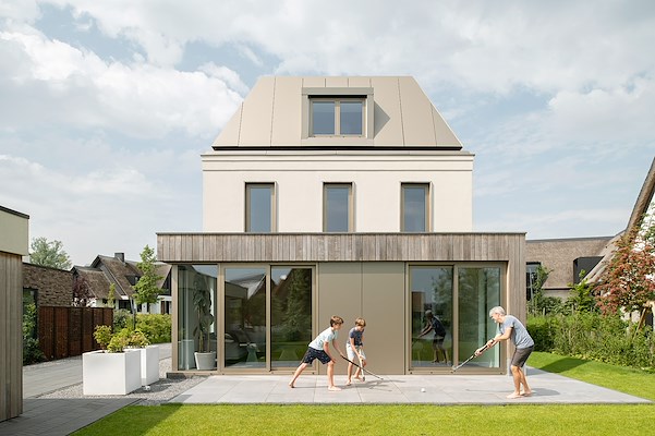 EElke verdieping van deze vrijstaande woning in Maassluis maakt deel uit van een collage. Voor elk niveau is de mooiste optie gekozen, te beginnen met de met hout beklede begane grond, die net als een bungalow grote ramen heeft die zorgen voor vloeiende overgangen tussen het interieur van de woning en de buitenwereld. Daarboven bevindt zich de verfijnde eerste verdieping, bekleed met een zandkleurige pleisterwerkafwerking, met kroonlijsten en verticale ramen omlijst door delicate kozijnen. Tot slot, bovenop het geheel, het glanzende champagnekleurige mansardedak met een dakkapel precies in het midden, dat eruitziet alsof iemand de essentie van Parijs heeft vastgelegd in een kindertekening. Het is indrukwekkend dat deze variëteit niet alleen opgaat in een samenhangend ontwerp, maar ook een duidelijk, eenvoudig, goed ontworpen volume vormt. Dit is vooral te danken aan de zorgvuldig geplande details die de architecten gebruiken om een relatie tussen de verdiepingen te creëren en subtiele associaties te bereiken. Tegelijkertijd zijn deze details altijd minimalistisch en hedendaags. Het uiterlijk is echter bedrieglijk: een verrassend element is bijvoorbeeld de bouw van het huis met hout en zware cross-laminated timber (CLT) panelen. Niet alleen zijn deze bijzonder duurzaam, betaalbaar en slijtvast, ze creëren ook een gezellige sfeer met hun warme, robuuste oppervlakte. De gevels van de begane grond en de stenen omlijstingen van de ramen op de bovenverdieping zijn eveneens gemaakt van hout. De kroonlijsten, die vroeger van steen of hout werden gemaakt, zijn niet meer dan twee delicate pleisterranden die de horizontale lijnen in de verschillende bouwlagen en de gevelprofielen herhalen. De bouwmethode, de vorm en het gevelontwerp zijn het resultaat van hedendaagse eisen op het gebied van energie, materiaal- en ruimte-efficiëntie. De oriëntatie van het gebouw, de indeling van de kamers, de hoeveelheid glas en de compacte vorm van het volume houden het energieverbruik tot een minimum, waarbij voldoende energie wordt geleverd door een geothermische warmtepomp. Het mansardedak maakt optimaal gebruik van de ruimte op het dak, en de hoogte van de nok en het aantal verdiepingen passen nog steeds goed bij de omliggende wijk. Het dak lijkt te zweven en hoewel het aanvankelijk in metaal lijkt te zijn bekleed, zijn de panelen die je daadwerkelijk ziet ALUCOBOND® panelen in anodized look C32. Weerbestendige ALUCOBOND® panelen verhogen de levensduur van het dak, verminderen het onderhoud en minimaliseren de installatiehoogte, terwijl ze toch dikke isolatie mogelijk maken. Het champagnekleurige oppervlak past smaakvol bij de raamprofielen in dezelfde kleur en de warme tinten in het pleisterwerk en de houten oppervlakken. Het uniforme kleurenschema, de ingetogen details en de symmetrische gevels verenigen verschillende elementen binnen een gedeeld contour. Het was echter niet slechts een impuls of ingeving die dit associatieve collage en zijn gestroomlijnde contour heeft gecreëerd; het is het resultaat van langdurige overwegingen over technische, structurele, ruimtelijke en energieverbruiksaspecten.