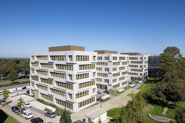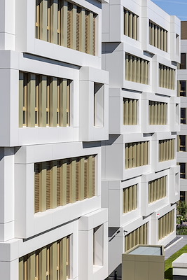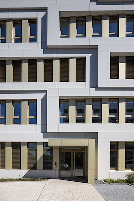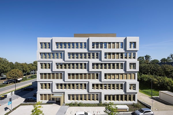 In photography, it is the number of pixels, i.e. the fine granular detail and the scattering of light which sharpen the contours. A clear image requires both contours and complexity, just like this unexpectedly intricate façade in Dortmund, a surprise for motorists driving out of town on the busy B1 urban motorway. It forms a comb structure with the back of the building running alongside the road; on the other side, three building tracts, with two courtyards in between, branch off from the main section and open up towards the south. The building is the latest addition at adesso, one of the leading IT companies in Germany. The noisy but high-profile location will, no doubt, be an advantage for the company, providing the designers succeed in creating a clearly defined street-facing northern façade. One which does not, as so often the case, just leave a vague, blurred impression on the memory when glimpsed by those speeding past. Bearing this in mind, the designers at the construction firm Freundlieb, opted for ALUCOBOND® tray panels in varying depths for the outer building surfaces, and they used them to cover the six-storey building from top to bottom. The building envelope looks like a shoal of fish creating a larger contour using swarm intelligence. In this respect, the façade is quite an apt representation of a software developer’s image. The scale-like features are staggered in relation to each other and generate different sized shadows, which vary over the course of the day, and present altering perspectives of the same side of the building. The façade is given depth and vigour. Façade design and production were both carried out with mathematical precision: each fish scale, clad in beige ALUCOBOND®, frames a band of windows. The band itself comprises a series of upright windows and closed surfaces in anodised look C2 Light Gold. ALUCOBOND®. The façade is, indeed, the sum of numerous separate yet identical parts, which add up perfectly along its length and fit into a very exact façade grid. Both a complex substructure and precision installation for the ALUCOBOND® tray panels were essential to make this possible. Using 3D computer modelling, the team designed the building envelope and, to ensure accuracy, had all the individual parts calculated and cut to size accordingly. Nothing could be more appropriate since this is a building for an IT company which, among other things, wants to push ahead digitalisation in the construction industry. The smallest parts, the finest granular particles, fit together precisely and intelligently to form a complex big picture with clear contours. This holds true for fish, photography and architecture.