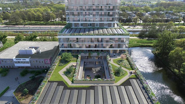 In opdracht van Synchroon heeft Orange Architects 190 appartementen en het concept ontwerp voor een alles-in-één school ontworpen op het terrein van het bestaande SITA-kantoor aan de Heathrowstraat in Amsterdam. Het project, genaamd Floating Gardens, stelt een integrale ontwikkeling voor met publieke functies in de plint en appartementen erboven. Het gebouw is opgebouwd uit lagen van verschillende grootte, waardoor het mogelijk is om op verschillende niveaus van het gebouw groene daktuinen aan te leggen.In Floating Gardens draagt de hele gevel van het gebouw bij aan het mogelijk maken van duurzaam wonen. De horizontale gevelbanden bestaan uit unieke, witte zonnepanelen en fungeren als vaste zonwering. Verticale, glazen panelen zorgen voor de benodigde akoestische bescherming, terwijl houten gevelbekleding en plantenbakken zorgen voor een groene uitstraling.Voor dit prachtige project leverden wij de Douglas houten geveldelen, die wij verduurzaamden met Woodlife HL 50; brandvertragend behandelden met Flame Delay PT en afwerkten met Sansin Enviro Stain SDF.