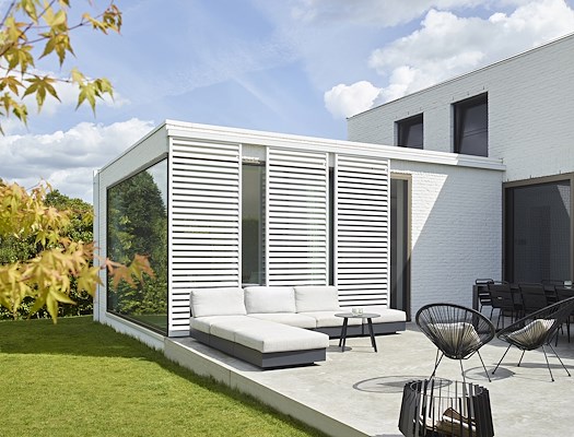 Naast isolatie en ventilatie in hun bestaande woning opteerde architecte Annelies Geens voor een extra leefruimte via een uitbouw. Aan deze uitbouw, die uit grote glaspartijen bestaat, werden Loggia-schuifpanelen toegevoegd om de binnentemperatuur onder controle te kunnen houden tijdens de warme zomermaanden. Praktisch én esthetisch tegelijk, de tandem die als rode draad doorheen de volledige verbouwing loopt.