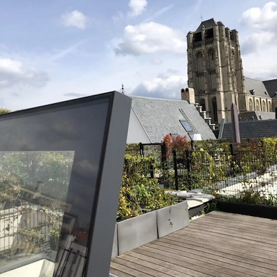 Een aantal appartementen beschikt ook over een eigen stadstuin, een oase van rust, terwijl je toch op een steenworp afstand van de drukte van de stad zit. De dakluiken zijn specifiek ontworpen voor elk terras, met een strakke belijning en de Sky Only View, die perfect in de architectonische omgeving passen. Ze zorgen niet alleen voor een prachtig uitzicht, maar brengen ook een overvloed aan daglicht en frisse lucht naar binnen, wat bijdraagt aan een gezond leefklimaat.