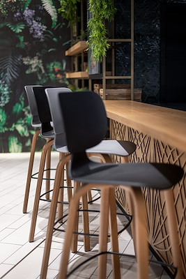 Klöber CoMeet barkrukken met een zithoogte van 76 cm en 61 cm, samen met CoMeet stoelen, dragen bij aan de sfeer in het Lago Centre.