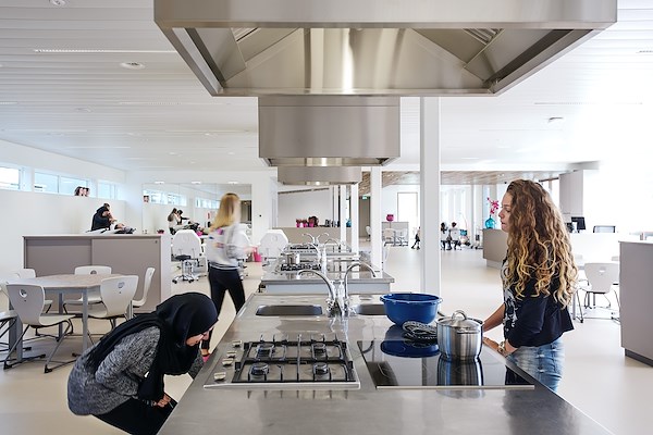 Twee hoofdentrees, een voor de leerlingen van HAVO en VWO en een voor de leerlingen van het VMBO en de Praktijkschool, komen beide uit op een brede boulevard door het gebouw die toegang geeft tot alle individuele leerclusters. Onderweg voert de boulevard langs een binnentuin, een plein dat gebruikt kan worden als theater en een reeks terrassen, waar het in pauzes en na school leuk is om samen te komen en elkaar te zien. Overal is licht en zijn doorkijkjes naar andere delen van het gebouw, dat een aangenaam heldere en open sfeer ademt.