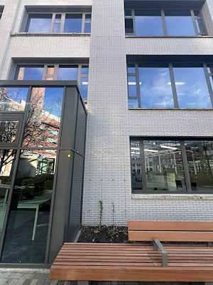 Aan kantoorgebouwen van de gemeente Antwerpen met rvs-spankabels en rvs-kabelgaasnetwerken klimhulp aangebracht voor het vergroenen van een openbare binnenplaats.