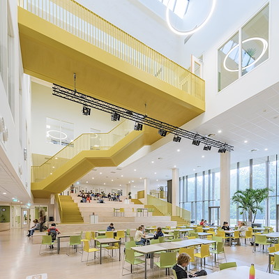 De multifunctionele aula verbindt de vier onderwijsdomeinen. De speelse tribune met terrassen en trappen is hier als een amfitheater gericht op het podium. Deze ligt direct achter de transparante gevel aan het plein zodat de Campus zich optimaal naar haar omgeving kan presenteren. In de oude huisvesting werd het zicht op het podium belemmerd door kolommen in de aula. In de nieuwbouw hebben we dit als ontwerpteam integraal opgelost met een ‘omgekeerde constructie’ waarbij de verdiepingsvloeren boven het schoolhart aan de dakconstructie hangen. De open aula maakt de constructieve, houten kern zichtbaar over drie verdiepingen.