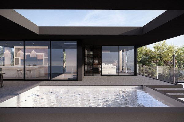 Twee zwembaden bevinden zich op tegenovergestelde hoeken van de gevel en worden visueel verbonden door een verzonken lounge. Deze zitkuil lijkt als een spiegelbeeld boven het water te zweven en herbergt een lounge, jacuzzi en een tweezijdige bar — het sociale hart van het huis.