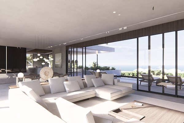 Horizon House ligt ingebed in het natuurlijke landschap van Coral Estate en straalt een stille kracht uit. Met zijn horizontale silhouet volgt de villa de zachte lijnen van het terrein en vormt zo een helder architectonisch gebaar dat zowel ruimtelijk als aards aanvoelt.