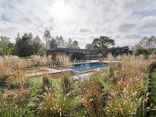 Een van de bakstenen muren wordt verder de tuin ingetrokken en vormt de achterwand van het zwembadhuis. Een prachtige zwemvijver, gevoed met water dat opborrelt uit de peelrandbreuk, versterkt deze lijn. Rijkelijke beplanting in de vijver rondom het zwemgedeelte, verbindt de vijver met de wilde bloemrijke tuin die rondom de woning stroomt.