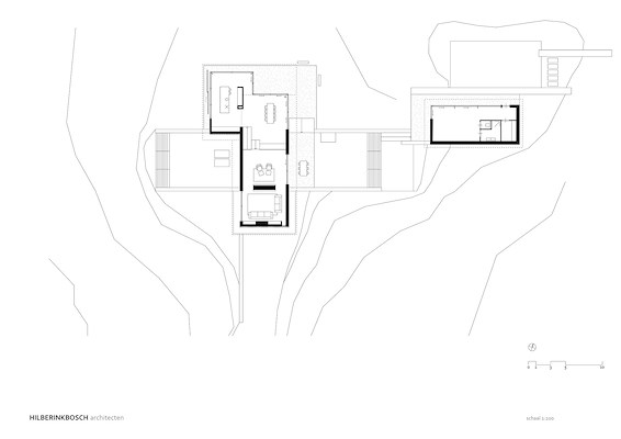 Door de geometrie van de woning, de uitvliegende wanden, omzoomd door een wilde begroeiing die overloopt in het kruidenrijke graslandlandschap, wordt een omgeving gecreëerd die speelt met licht, uitzicht en zichtlijnen en waar binnen en buiten continue in dialoog zijn.