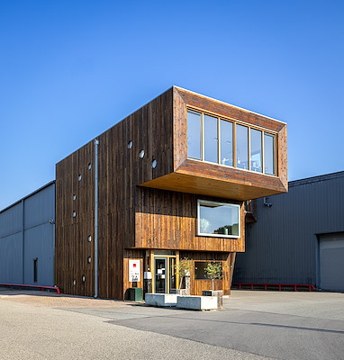 Ombouw van industriele doos naar prachtig attractief kantoorpand. JM Concepten/StrandBaak heeft gekozen als gevelbekleding voor Royal Wood boards in 3 verschillende breedtes in de kleur teer-bruin. Royal Wood is uiterst milieuvriendelijk en heeft een lange levensduur zonder dat er intensief onderhoud nodig is. Hoogwaardige kwaliteit met een natuurlijke uitstraling. Het open karakter van het pand en de speelse partijspoortjes maken het project tot een geheel.