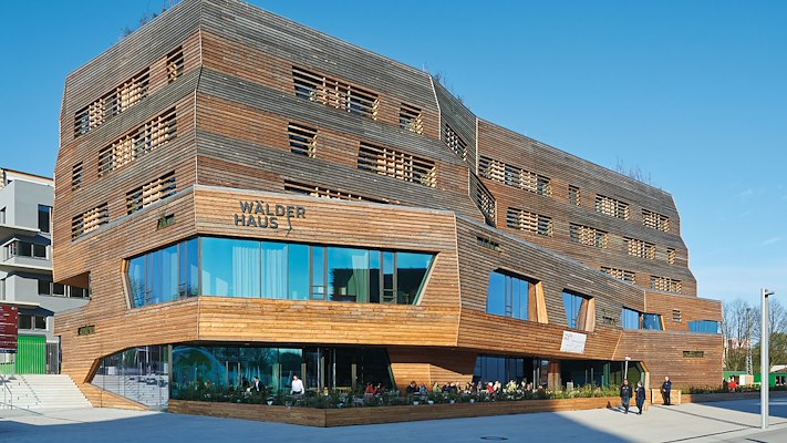 Het WÄLDERHAUS staat op 128 geboorde palen, waarvan er 94 dienen als energiepalen voor aardwarmte. Samen met hoogwaardige isolatie en een groendak dat regenwater opvangt, is het gebouw een inspirerend voorbeeld van duurzame bouw. Het resultaat is een multifunctioneel complex dat volledig klimaatneutraal opereert.
