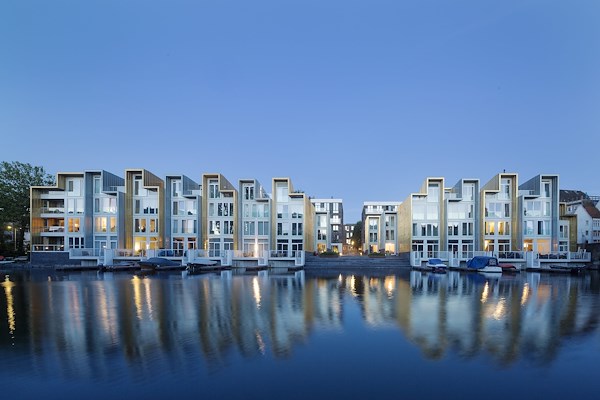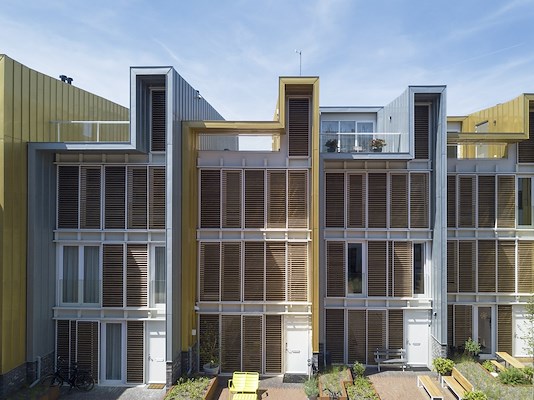 Aan die openbare binnenplaatsen liggen de entrees van de waterwoningen. Deze eengezinswoningen aan de Oostenburgergracht staan haaks op het water, geïnspireerd op de voormalige werven op deze plek. Waar voorheen de scheepshellingen lagen, is vanuit de buurt nu opnieuw de toegang tot het water. Deze woningen zijn herkenbaar aan hun afwisselende bekleding met koper en zink.