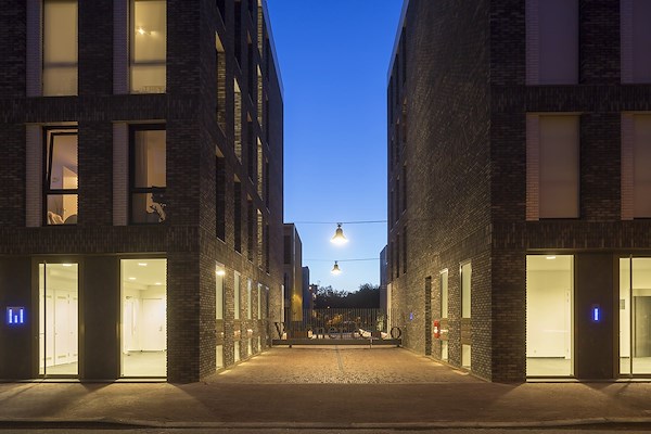 Langs de Oostenburgervoorstraat staan twee stoere pakhuisachtige gebouwen, eveneens met appartementen. Ze zijn gemetseld in een stoere Bemmels blauwe steen, met wit geglazuurde accenten in de neggen van de kozijnen en bij de dakranden. De hoogte van vijf verdiepingen past bij de maat en schaal van de bestaande bebouwing in de straat. Op de begane grond zit een druk bezocht café. Ernaast liggen de entrees van de appartementen en een doorgang naar het hof, en naar de hofwoningen met hun grote buitenruimte aan het groen.
