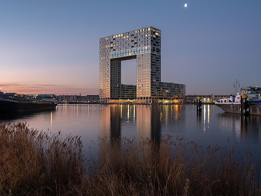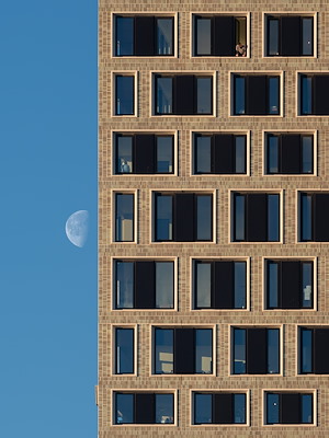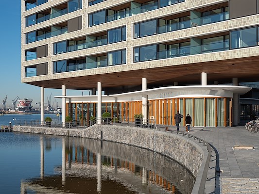 Om het stedelijk leven naar binnen te halen, is het woongebouw zeven meter opgetild. Het plein binnen het volume biedt een goed geproportioneerde openbare ruimte aan het water. Vanaf alle kanten blijven de zichtlijnen onder het gebouw open. Het grote gebouw is hierdoor verrassend lichtvoetig.